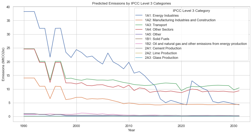 Create machine learning model to predict future emissions (category wise) based on historical data.